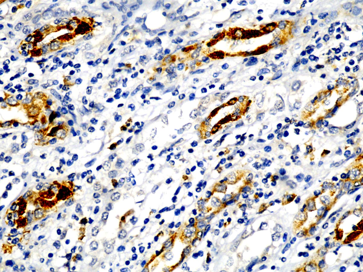AMACR/P504S is highly expressed in prostate, liver, and kidney carcinomas but rarely in stomach and bladder carcinomas. It is also expressed in other types of carcinoma such as breast carcinoma, pancreatic islet tumor and desmoplastic small round cell tumor. AMACR along with CKHMW and p63 may serve as a useful panel for the classification of premalignant high-grade prostatic intraepithelial neoplasia (HGPIN) and prostate adenocarcinoma.