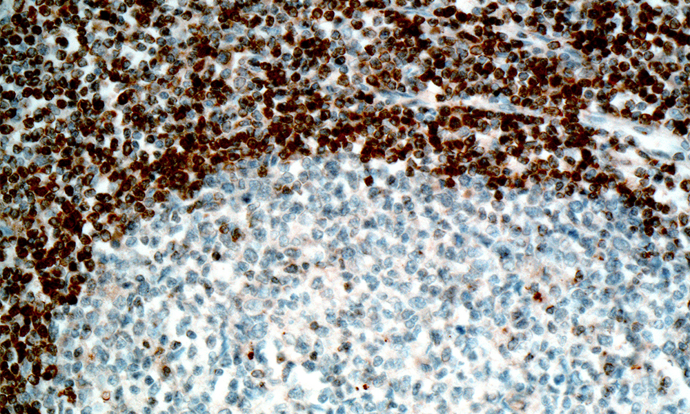 Clone 100 reacts with Bcl-2 alpha oncoprotein as assessed by reaction with a 26-kD band in immunoblotting. The Bcl-2 is expressed on mitochondrial inner membrane protein and is frequently overexpressed in many lymphoid malignancies. This protein prevents programmed cell death independent of promoting cell division. Immunohistologic studies have demonstrated that staining for Bcl-2 protein can be used to distinguish neoplastic germinal centers from reactive ones