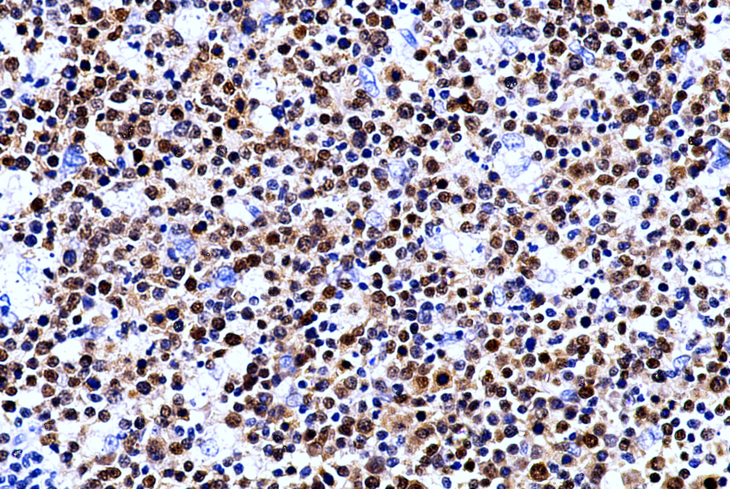 B cell specific Octamer Binding protein-1 is a Coactivator of OCT-2. It appears to mediate antigen-dependent germinal center formation. BOB1 is recommended for use as part of a panel of antibodies to aid in the differentiation of malignancies of B cell origin. BOB.1 expression in a variety of established B-cell lines, represents different stages of B-cell development has shown a Bcell-specific expression pattern. LP cells in nodular lymphocyte that are predominant Hodgkin lymphoma their germinal centerderived are consistently immune positive for BOB.1. Some cases of classical Hodgkin lymphoma show BOB.1 immune-reactivity with the Hodgkin and Reed-Sternberg cells. Expression of BOB.1 was said to be seen in follicular center cell lymphoma, diffuse large B-cell lymphoma and some acute myeloid leukemia. B-CLL, marginal zone lymphoma, and mantle cell lymphoma may show weak to moderate staining