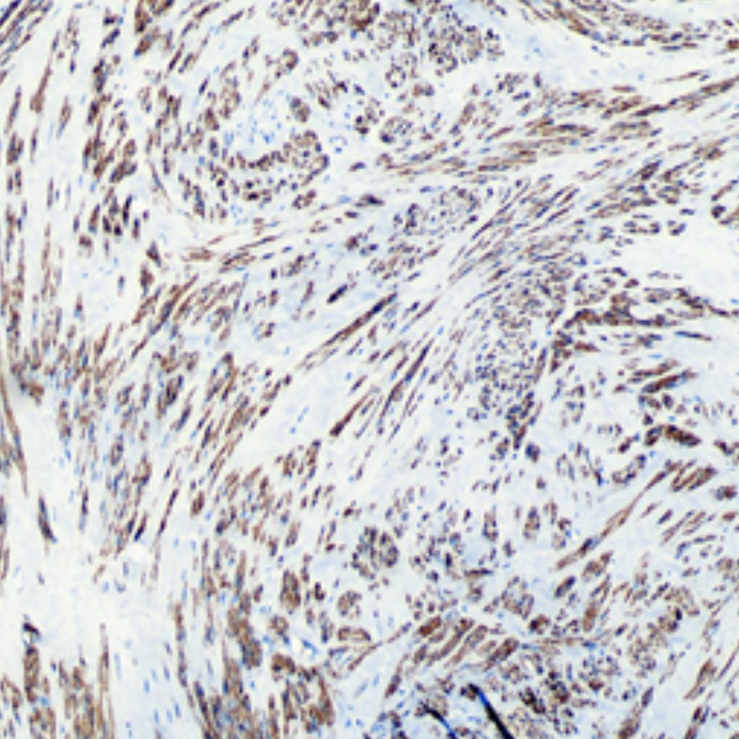 The clone CALD1/7024R is a recombinant rabbit monoclonal antibody specific for caldesmon, validated for IHC. It demonstrates strong cytoplasmic staining in smooth muscle tissues and smooth muscle tumors, with minimal background in negative tissues, making it valuable for diagnostic histopathology and research in soft tissue pathology