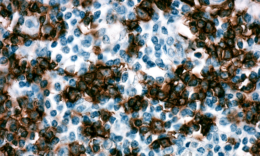 This antibody reacts with a formalin-resistant intracytoplasmic epitope found in the majority of B cells which is now considered to be the CD20 antigen, a pan-B cell marker. The antibody primarily recognizes a 33 kD polypeptide B cell component and also a minor 30 kD cellular antigen. The staining pattern is consistent with pan-B reactivity, producing staining for B cells in lymphoid and peripheral blood tissue. This antibody intensely stains germinal centers and B immunoblasts in lymphoid tissue.The L26 antibody is widely regarded as the most selective B cell marker currently available. L26 has shown no cross-reactivity with nonlymphoid tissues. L26 may prove to be a useful marker for L&H variants of Reed-Sternberg cells of Hodgkin’s lymphomas where reactive pattern is distinct from other Reed-Sternberg variants