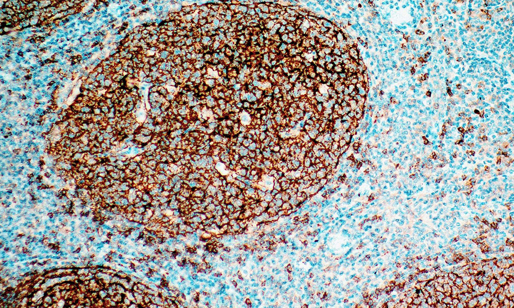 The B2 antigen, also known as CD21 and CR2, is a 140 kD glycosylated Type 1 integral membrane protein. The CD21 molecule is expressed on mature B lymphocytes, follicular dendritic reticulum cells (FDC), pharyngeal epithelial cells, and possibly on a subset of normal thymocytes. This antigen is also expressed by B lymphocytes in patients with B cell lymphomas, most B cell chronic lymphocytic leukemia (CLL), and a small portion of non-T cell acute lymphoblastic leukemias (ALL)