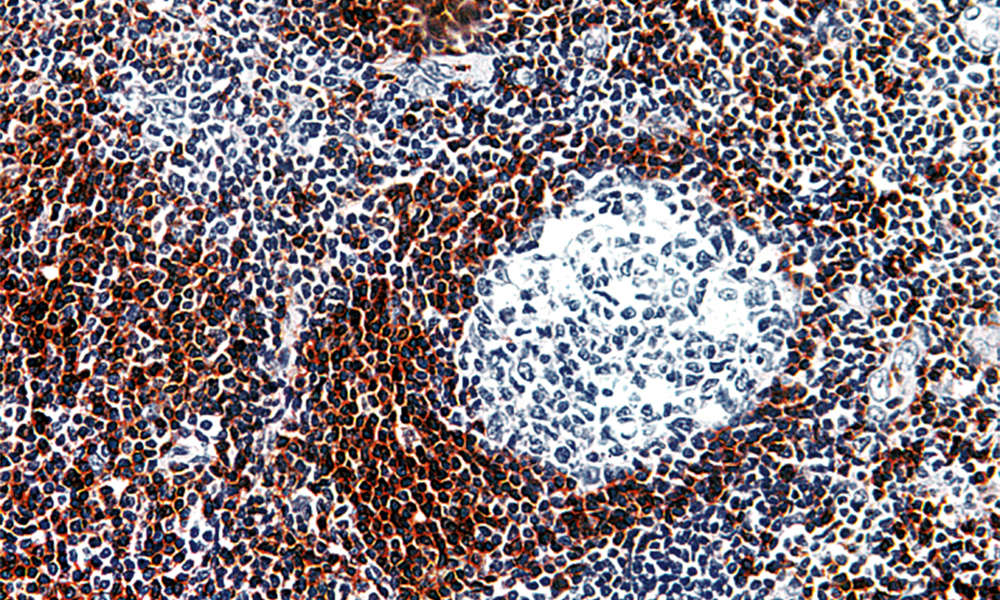 Clone MT2 has previously been described as anti-CD45RA but due to its reactivity with transfectants and its identical staining pattern with ORTH75E4, it is now recognised as anti-CD45RC. Clone MT2 reacts with membrane-bound antigen which is present on mature, non-activated T and B cells. It reacts with medullary thymocytes, with mantle zone lymphocytes in follicles of lymph nodes and spleen, with lymphocytes of the paracortex, with peripheral blood B cells, with T suppressor/cytotoxic cells and NK cells. This clone is used for differentiation of non-Hodgkin lymphomas.