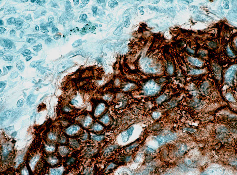 The rabbit antibody to EGFR (LRVAP) reacts with the 170 kD EGFR transmembrane glycoprotein. It binds specifically to the intracellular portion, regardless of phosphorylation state. The extracellular domain binds epidermal growth factor (EGF) as a proliferation signal. The EGFR antibody is made against a sequence which is unique from related tyrosine kinase receptors and hence shows no cross-reactivity.
