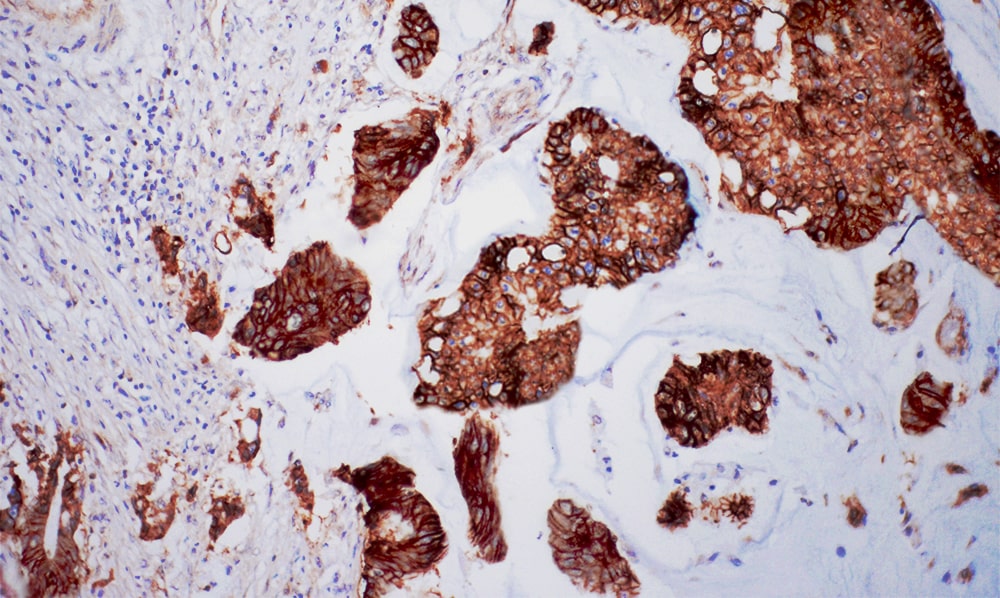 Ep-CAM (epithelial cell adhesion molecule) or MOC31, Ber-EP4 is a highly conserved type I transmembrane glycoprotein expressed on most malignant and normal epithelial cells. Ep-CAM is detected at the membrane/cytoplasm of the majority of epithelial tissues (all simple, pseudo-stratified and transitional epithelial), with the exception of the adult squamous epithelium and such as hepatocytes, epidermal keratinocytes, gastric parietal cells, myoepithelial cells, some epithelium-derived cell, ?thymic cortical epithelium. In tumors, Ep-CAM is over expressed by the majority of human epithelial carcinomas, except hepatocellular carcinomas (HCC)