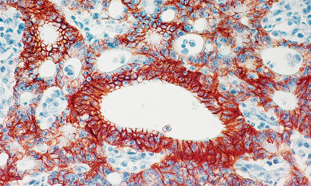 Monoclonal antibody MOC-31 recognizes the cluster 2 antigen which is a 40 kD transmembrane glycoprotein present on the membrane of epithelial cells. It is a highly reliable and sensitive marker to distinguish between reactive epithelial and mesothelial cells. Since MOC-31 reacts with virtually all normal epithelia and adenocarcinomas but not with mesothelial cells, this antibody can serve as a reliable marker for determining the origin of pleural and peritoneal tumors.