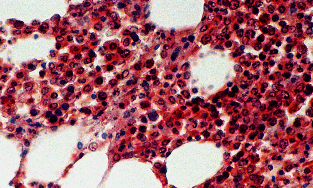 The BM-2 antibody can provide important differentiation information and may be used along with antibodies BM-1 and BM-3 to stain early precursor and mature forms of human myeloid cells. This group of monoclonal antibodies reacts with antigenic determinants present in normal myeloid cells and leukemias of similar derivation. BM-2 recognizes an antigen present in the cytoplasm of mature granulocytes. This antibody stains granulocytes present in normal tissue or inflammatory processes.