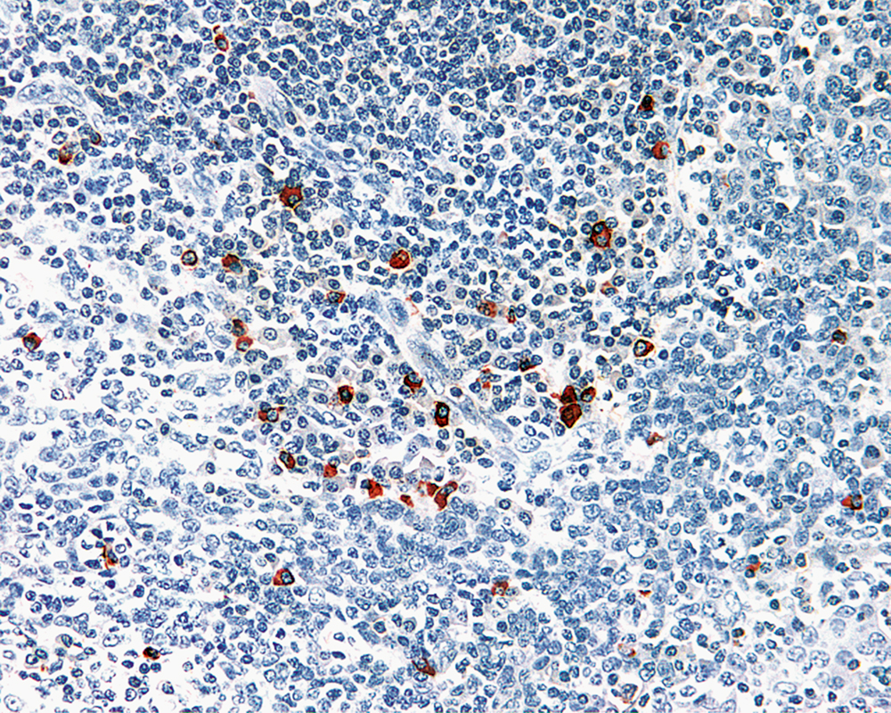 This monoclonal antibody reacts with Fc region of 900kD pentameric human IgM heavy (mu) chain. It has no cross reactivity with IgA, IgG or with light chains. This antibody stains IgM containing plasma cells, but not surface IgM and immune complexes. It is useful for the evaluation of majority B cell lineage derived plasmacytomas, non-Hodgkin’s lymphomas and leukemias. The common underlying feature of these malignancies is the restricted expression of heavy and light chains to a single heavy and light chain type.