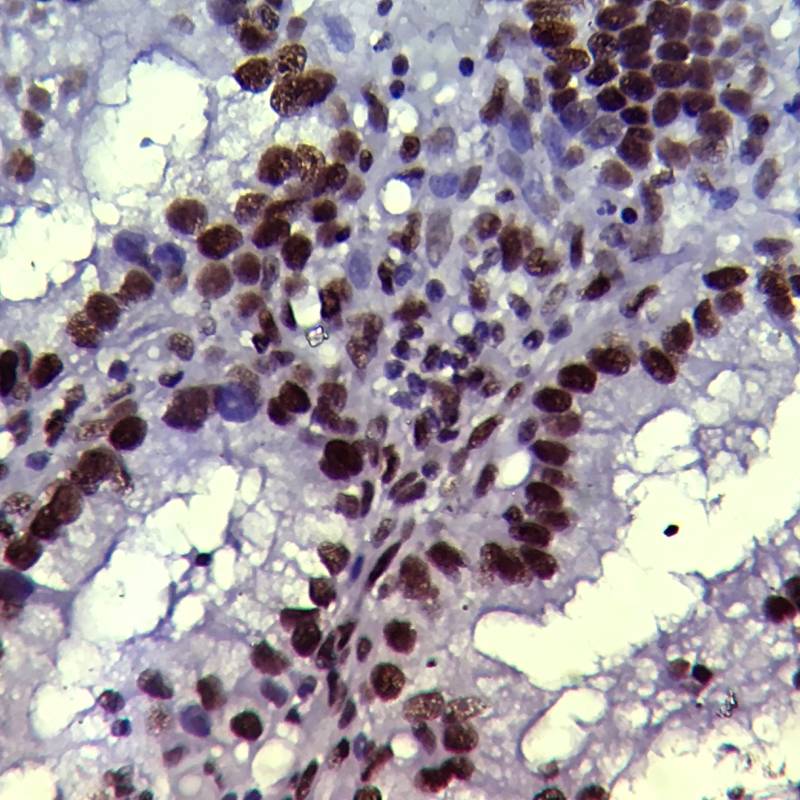 Integrase interactor 1 (INI-1), also known as hSNF5, is an integral component of the hSWI/SNF (SWItch/Sucrose NonFermentable) chromatin remodeling complex, which facilitates DNA dependent cellular processes including transcription, replication, and repair. The INI-1 gene is often mutated or deleted in malignant rhabdoid tumor (MRT), a tumor which is potentially mimicked by medulloblastoma and supratentorial primitive neuroectodermal tumors (sPNETs). The morphology of MRTs can present challenges in differential diagnosis. The overall survival of MRTs relative to its potential mimics [medulloblastoma, supratentorial primitive neuroectodermal tumors (sPNETs)] is quite low, and thus differentiation from these other tumors is desirable. INI-1 has shown to be useful in distinguishing between the three conditions as the majority of medulloblastomas and sPNETs are labeled by Anti-INI-1, while a lack of nuclear labeling by the same antibody is characteristic of MRT.