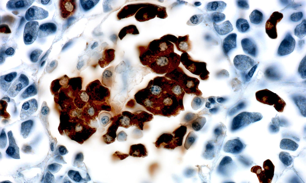 Insulin is synthesized in the beta cell of the pancreas. It is a glucose homeostasis regulating hormone. It acts by increasing cell permeability to monosaccharides, amino acids and fatty acids, and accelerating glycolysis, the pentose phosphate cycle, and glycogen synthesis in the liver. One million to three million islets of Langerhans (pancreatic islets) form the endocrine part of the pancreas, which is primarily an exocrine gland produces Insulin. The endocrine portion accounts for only 2% of the total mass of the pancreas. Within the islets of Langerhans, beta cells constitute 65-80% of all the cells. The antibody labels both normal and neoplastic insulin-producing cells. It is useful in identifying insulinoma