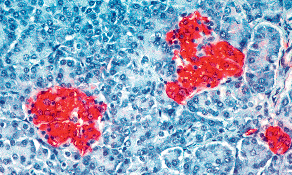 Insulin is a peptide hormone produced in the pancreas by the B cells of the islets of Langerhans. Its functional role is to promote glucose utilization, protein synthesis, and the formation and storage of neutral lipids. Lack of this hormone gives rise to diabetes mellitus. Insulin-producing B cells are one of at least seven different cell types within the islets. These pancreatic endocrine cells are present not only within the islets but also in small and variable numbers in extrainsular locations. They can be present either singly or in small clusters along the pancreatic ductular epithelium, as well as within the particular acinar elements. The development of specific antibodies to various polypeptide hormones have made IHC localization of these hormones the most sensitive and reliable means available for an accurate characterization of the function of islet cell tumors. Since many islet cell tumors are multihormonal in nature, classification of the tumor is based on the predominant hormone present. Tumors producing large amounts of insulin are referred to as insulinomas. Insulin producing B cells occupy a central position in the islet, constituting 60% to 80% of the islet cell population. Islet cell hyperplasia and/or multiple adenomas are present in approximately 10% of hyperinsulinism cases. Multiple insulin-producing tumors, hyperplastic islets, areas of nesidioblastosis, and cells budding from the ductular structures stain positive for insulin. This antibody recognizes the A chain loop of human insulin. Cross-reactivity with bovine, rat and mouse insulin has been observed.