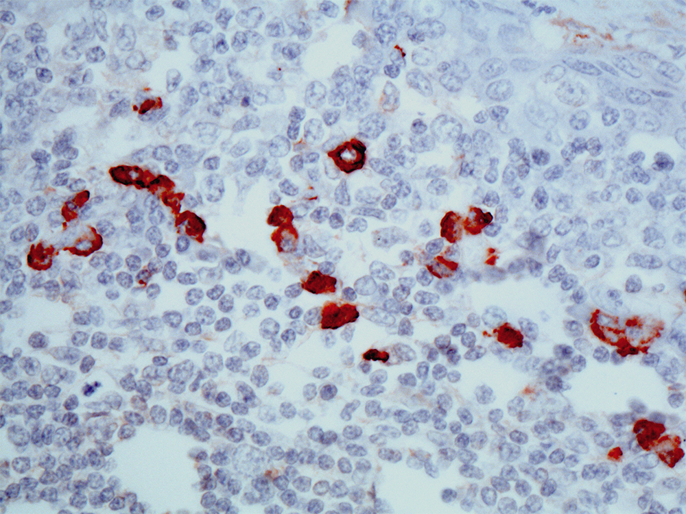 The light chains of immunoglobulin molecules may be either Kappa or Lambda The clonal nature of any immunoglobulinproducing cell population can be determined by its light chain structure. Lambda chains are expressed on the surface of Bcells. Antibodies to kappa and lambda light chains are used for the evaluation of leukemias, plasmacytomas, and certain nonHodgkin’s lymphomas, the majority of which are derived from B-cell lineage. The most important uses of this technique would be in distinguishing atypical reactive follicular lymphoid hyperplasia from follicular lymphoma, undifferentiated carcinoma from large cell lymphoma, pseudolymphoma from lymphoma, and reactive plasmacytosis from well differentiated plasmacytoma.