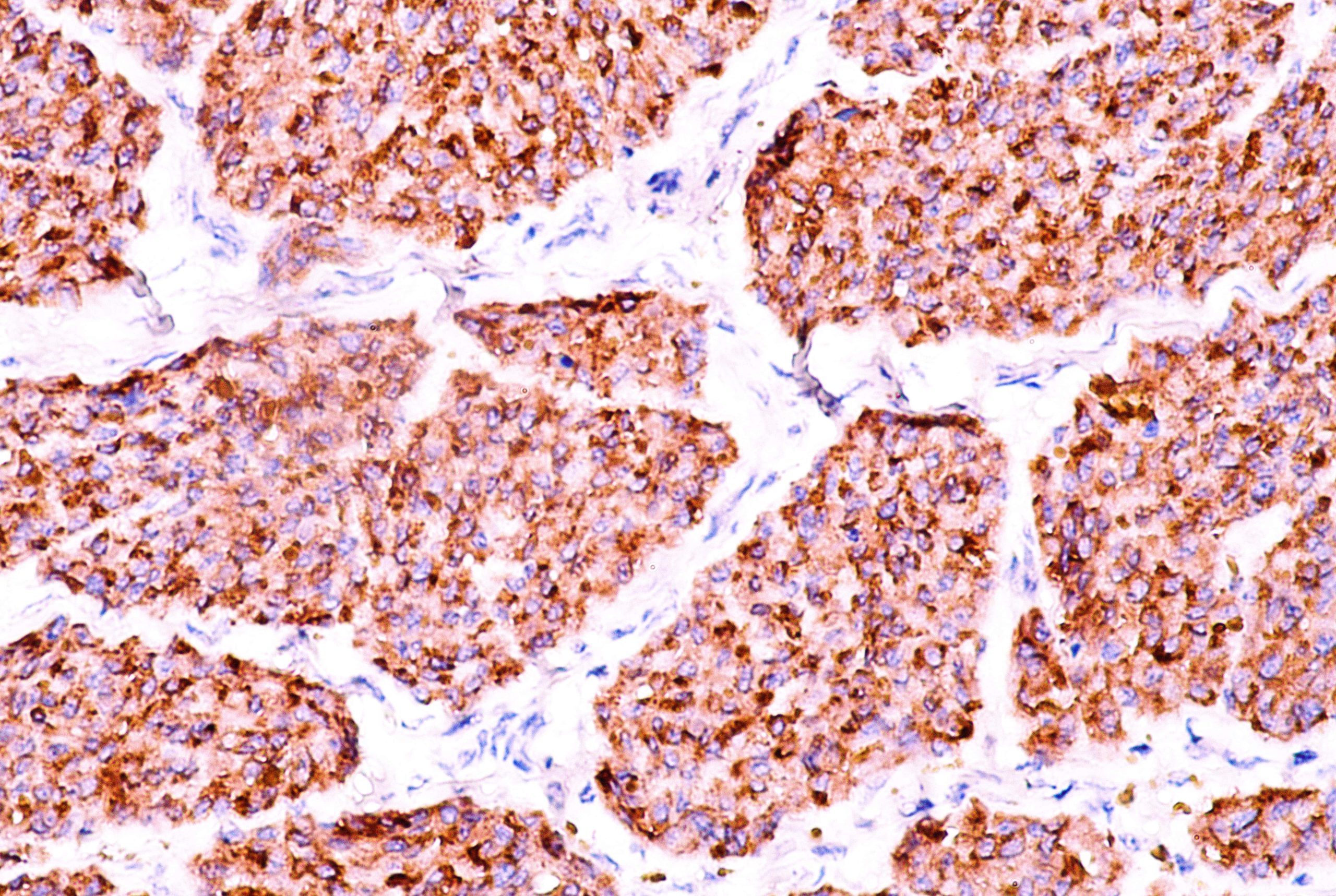 Melan-A, product of MART-1 gene, is a differentiation antigen which is expressed in 100% of melanocytes, most melanomas, and 50-6 % of melanoma cell lines. It is one of the melanoma antigens recognized by autologous cytotoxic T cells, and as an antigenic target for tumor infiltrating lymphocytes. This antibody also stains Melan-A in normal melanocytes and in retina. It does not stain normal or tumor tissues from nonmelanocyte lineages.