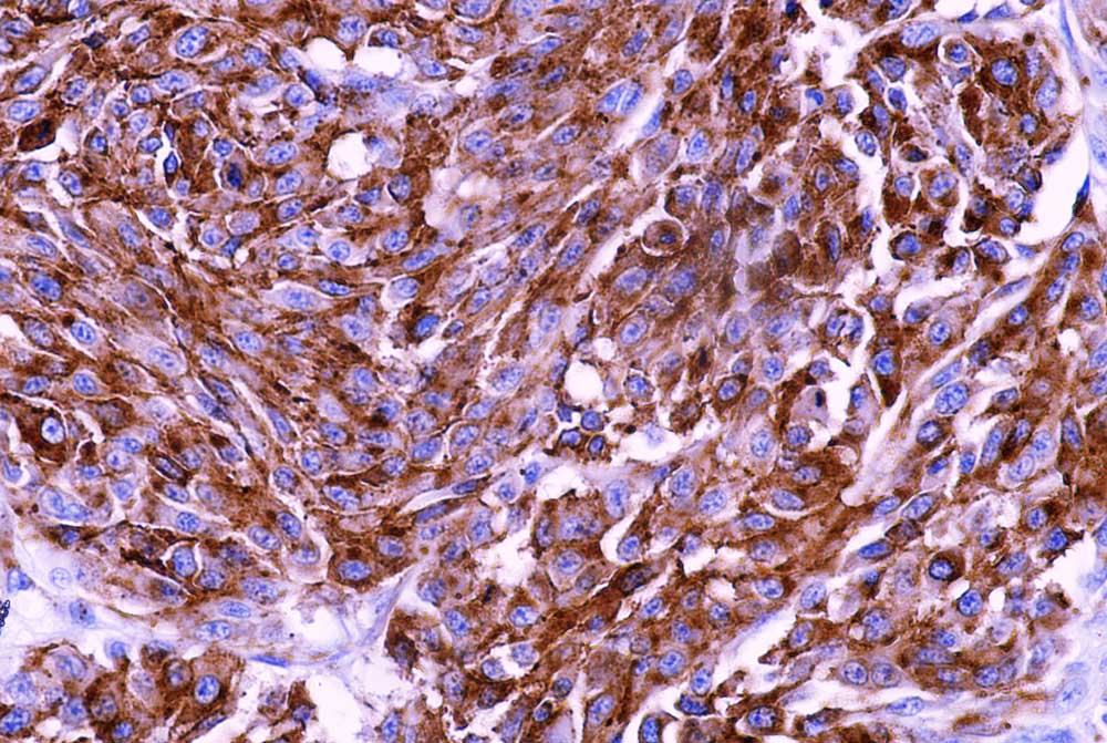 Melanoma marker is a cocktail antibody that has three melanoma-specific proteins, which include MART1, Tyrosinase and gp100. This cocktail antibody labels melanomas and tumors showing melanocytic differentiation.Melanoma-associated antigen recognized by T cells-1 (MART-1) (also known as Melan-A) is a melanocyte differentiation antigen recognized by autologous cytotoxic T lymphocytes. It is a transmembrane protein which is hydrophobic in nature. Tyrosinase is a coppercontaining metalloglycoprotein that catalyzes several steps in the melanin pigment biosynthetic pathway; the hydroxylation of tyrosine to L-3,4-dihydroxy-phenylalanine (dopa), and the subsequent oxidation of dopa to dopaquinone. This Antibody is a useful marker for melanocytes and melanomas.gp100, also designated ME20-M, ME20-S and PMEL 17, is classified as a melanocyte differentiation antigen and is expressed at low levels in normal cell lines and tissues, but is upregulated in melanocytes.