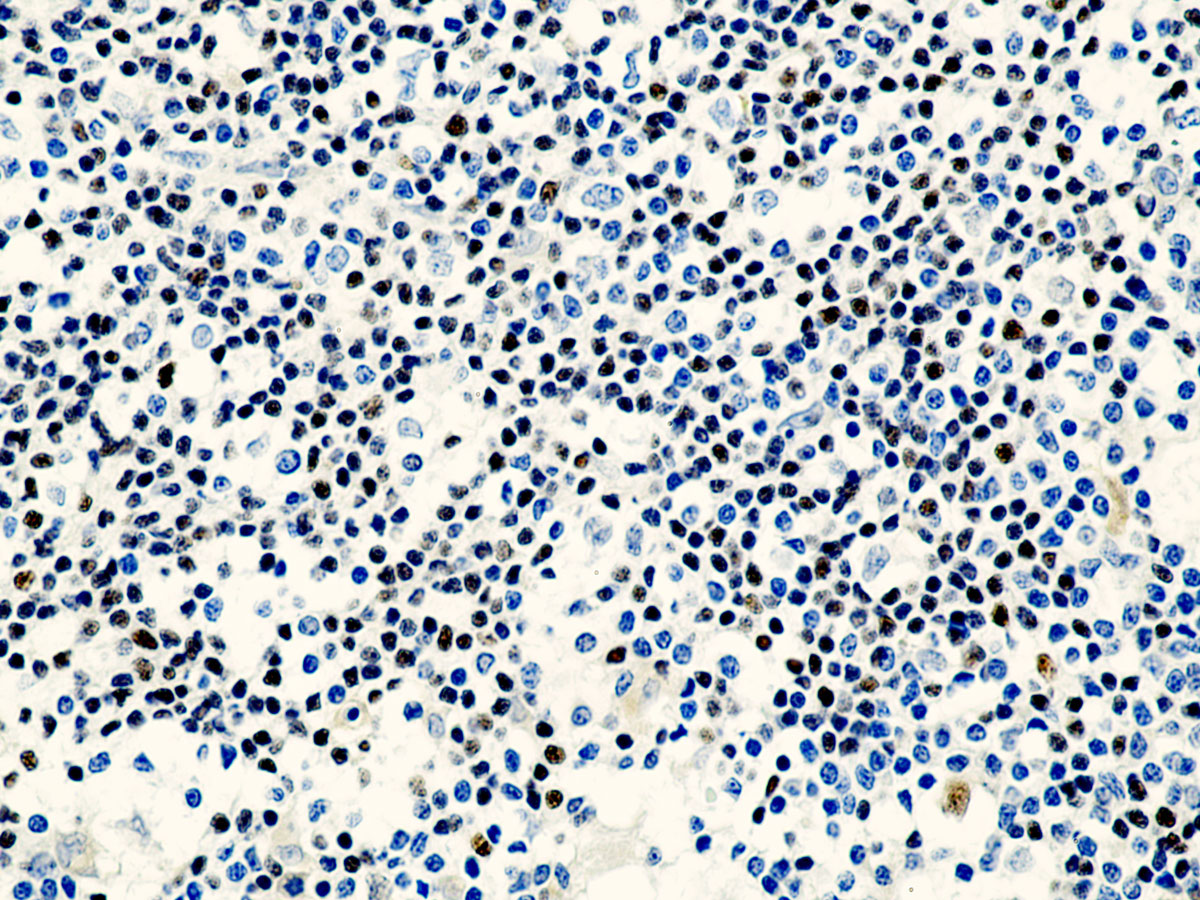 Octamer transcription factor-2 (OCT-2) possesses a leucine zipper domain and belongs to the POU family of transcription factors. It specifically binds to the octamer motif (5-ATTTCAT-3), activates immunoglobulin gene expression and regulates transcription in a number of tissues. OCT-2 is important for the expression of B cell specific genes, such as CD20 and CRISP-3. OCT-2 is expressed in mature B cells, predominantly germinal center B cells. Low expression of OCT-2 has been found in immature B cells, T cells and myelomonocytic cells, as well as epithelial and neuronal cells. The OCT-2 antibody labels various B cell lymphomas with strong expression in germinal center-derived lymphomas. In a study on Hodgkin’s lymphoma (HL), OCT-2 positivity was observed in all lymphocyte predominance HLs but none of the 29 classic HLs.