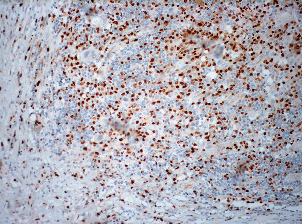 PU.1 is a transcription factor of ETS (E26 transformation-specific) family; it is required for hematopoiesis. It has a critical role in differentiation of normal myeloid progeny, and regulates the immunoglobulin gene expression and other genes that are significant for B cell development. PU.1 stains B lymphocyte in germinal center and mantle B cell, but not plasma cell. It labels many types of B cell lymphoma including mantle cell lymphoma, but it is not expressed in classical Hodgkin lymphoma (cHL). The lack of transcription factor PU.1 protein expression in cHL, a lympho- proliferative disease of predominantly B-cell origin, likely contributes to the lack of immunoglobulin expression and incomplete B-cell phenotype characteristic of the Reed-Sternberg cells in cHL.