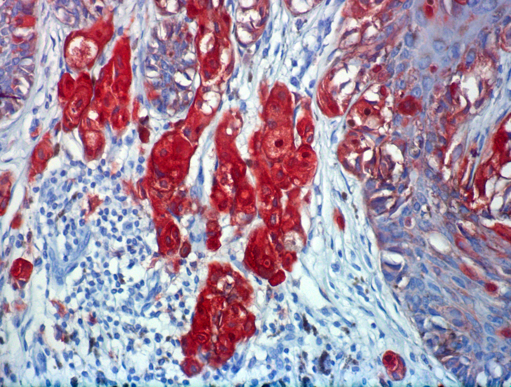S-100 protein was first extracted from the brain and at first believed to be a glial marker marker. S-100 protein is made up of two subunits, it has been identified that S-100 protein is differently expressed by various cells. This antibody shows one double peak (S-100 A and B) when tested in crossed immunoelectrophoresis against human and bovine brain extracts, and will react with S-100 protein from different species. S-100 protein beta subunit is secreted in a few tumors and all S-100 positive cells. The alpha subunit is secreted only in neurons and lymph node macrophages. The S-100 protein is a reasonably stable antigen that withstands formalin fixation and paraffin embedding. Consequently, the presence of S-100 protein is readily demonstrated in routinely processed malignant melanomas. S-100 protein expression was found in normal melanocytes, Langerhans cells, histiocytes, chondrocytes, lipocytes, skeletal and cardiac muscle, Schwann cells, epithelial and myoepithelial cells of the breast, salivary and sweat glands, in addition to glial cells. Neoplasms derived from these cells also express S-100 protein to varying degrees. A large proportion of well-differentiated tumors of salivary gland, adipose, cartilaginous tissue, and Schwann cell derived tumors express S-100 protein.