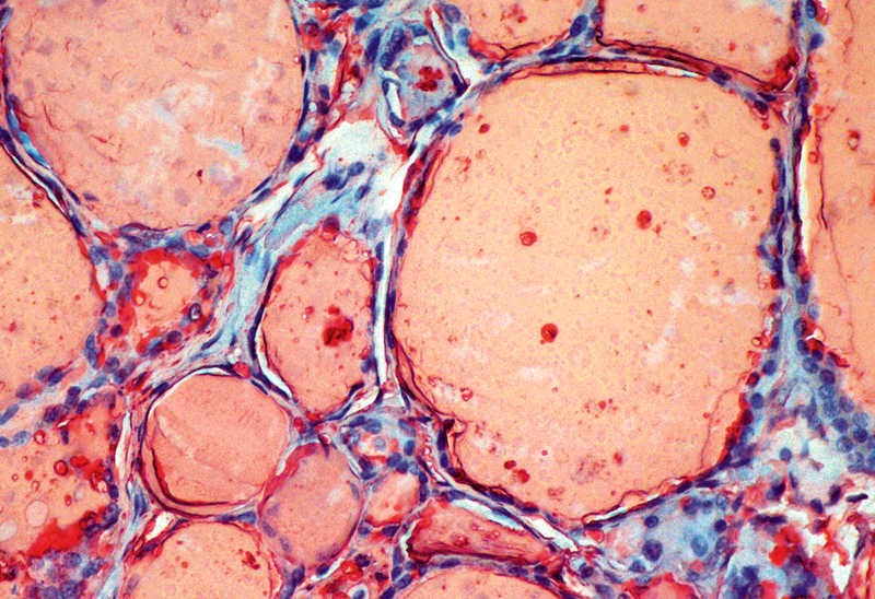 The main hormones produced by the thyroid are Thyroxine (T4 or tetraiodothyronine) and, on a much smaller scale, triiodothyronine (T3). T4 and T3 have been demonstrated in normal and neoplastic thyroid follicular cells. In thyroid cancer, however, the iodine content may be 1/100 that of normal thyroid tissue, whereas thyroglobulin is much more abundant, occurring at 1/2 to 1/3 that of a normal thyroid.