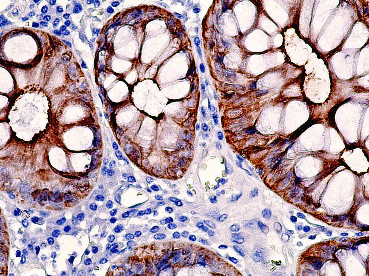 Villin is a 95-kDa F-actin bundling and severing protein belongs to gelsolin family. Unlike the ubiquitously expressed gelsolin, villin expression is restricted to epithelial cells with a brush border, like epithelial cells of the intestinal mucosa, gall bladder, renal proximal tubules and ductuli efferentes of the testis. It is localized to the apical cytoplasm and brush borders of these cells. It can interact with actin in a Ca2+ and phosphoinositideregulated manner. Villin has been reported to be an epithelial cell-specific anti-apoptotic protein, and to have an important function in regulating actin dynamics, cell morphology, epithelial-to-mesenchymal transitions, cell migration and cell survival. Villin is a useful diagnostic marker for of various cancers, like cervical and endometrial adenocarcinomas, renal cell carcinoma. Villin is a very specific marker for adenocarcinomas of the gastrointestinal tract, pancreas, lung, prostate and ovary.