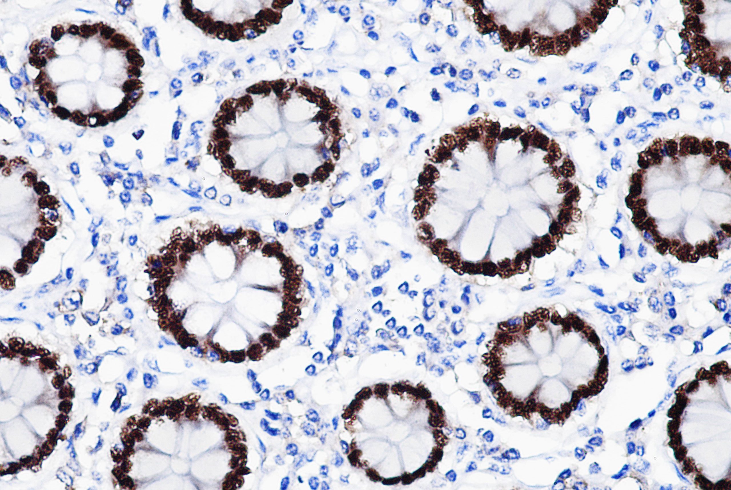 CDX2 (Caudal Type Homeobox 2) is a homeobox domain-containing transcription factor belongs to murine CDX family. It is an important protein in intestinal development, anterior to posterior patterning of the intestinal epithelium, proliferation and maintenance of the intestinal phenotype. CDX2 is localized in the nuclei of epithelial cells throughout the intestine. Expression of CDX2 is observed in primary and metastatic colorectal carcinomas, intestinal metaplasia of the stomach, intestinal-type gastric cancer, mucinous ovarian carcinomas, serous and endometrioid carcinomas.
