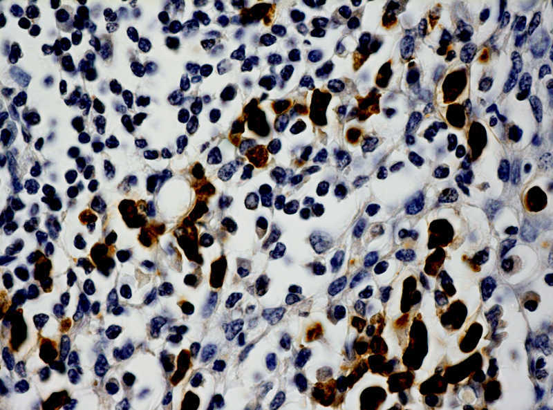 The oligonucleotide probe detects Lambda light chain mRNA in formalin-fixed, paraffin-embedded human tissues by in situ hybridization. The light chains of immunoglobulin molecules have two antigenic types: kappa and lambda. A given immunoglobulin molecule contains two identical light chains, either kappa or lambda. Therefore, the clonal nature of any immunoglobulin producing cell population can be determined by the light chain structure of the immunoglobulin that the cell produces. Lambda light chain restriction and its mRNA levels can be determined using in situ hybridization techniques. A mixture of non specific oligonucleotides that are of similar length to that of the Lambda probe is provided as the negative control.